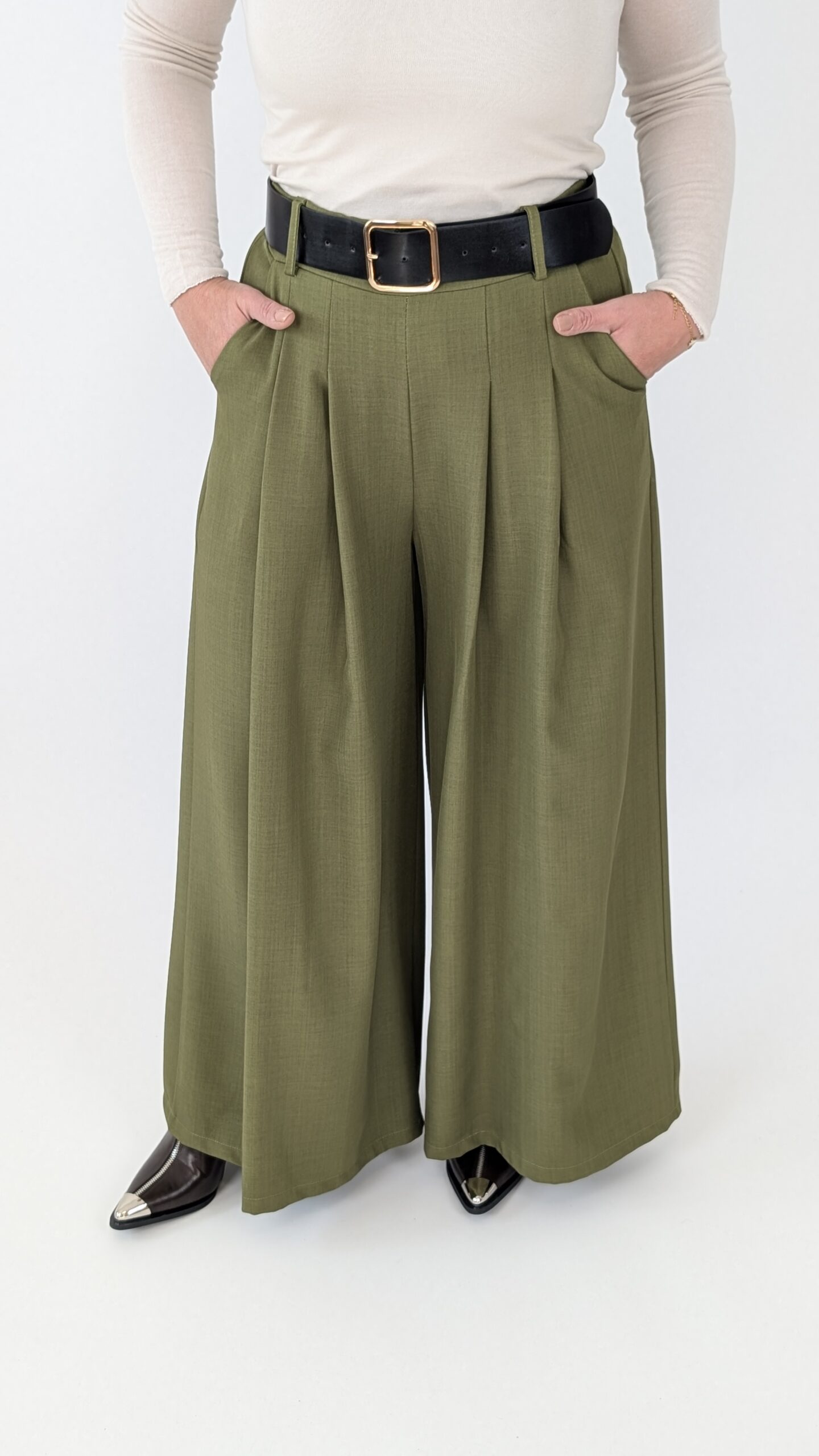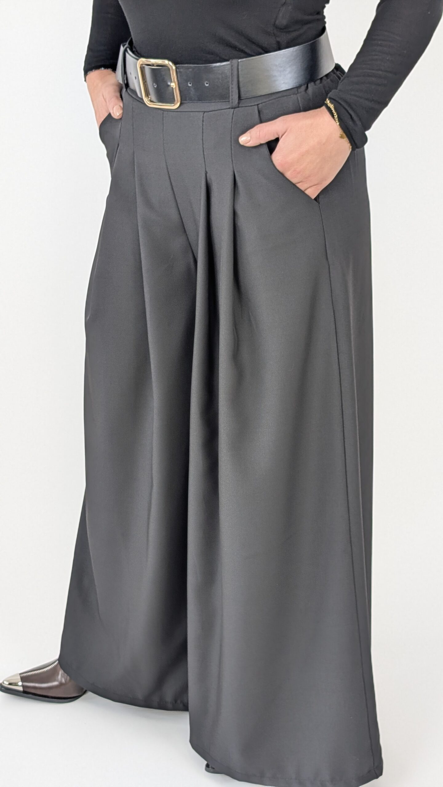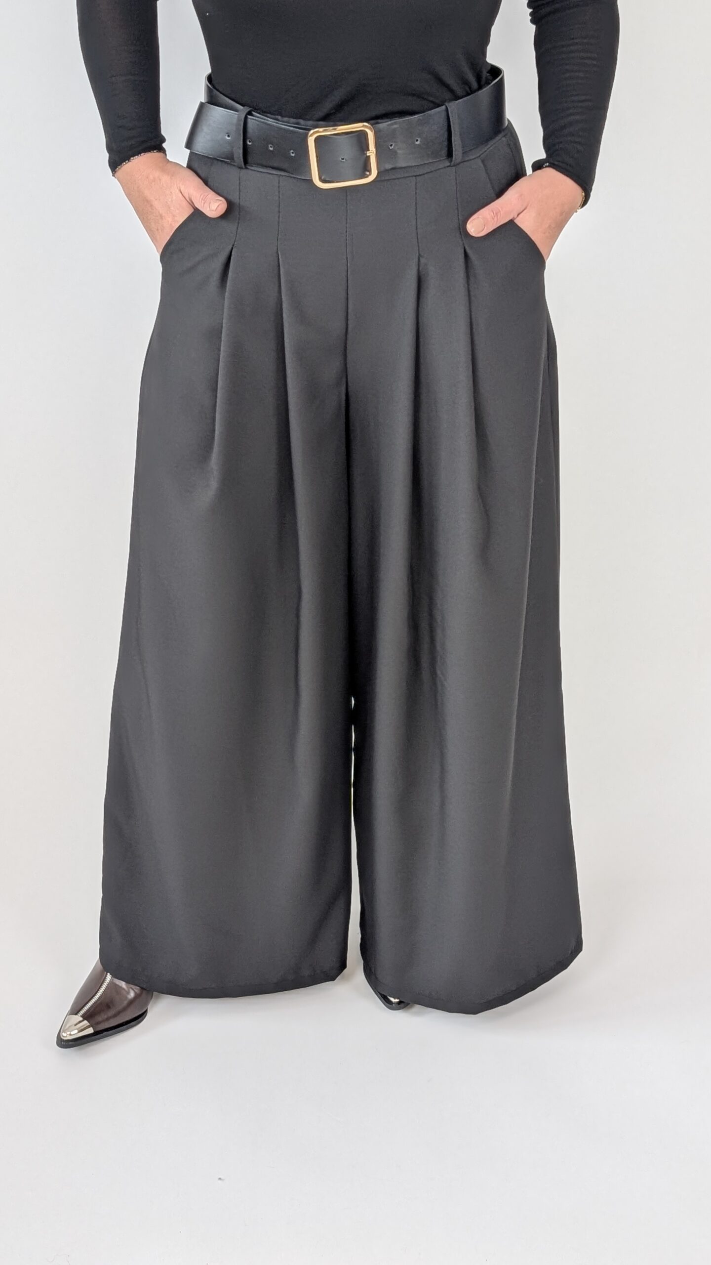 Elegantne široke hlače iz mehkega poliestra z dodatkom elastana za popolno udobje. Z gubami in žepi, kroj pa lepo poudari pas in podaljša silhueto. Velikost univerzalna (38–44).