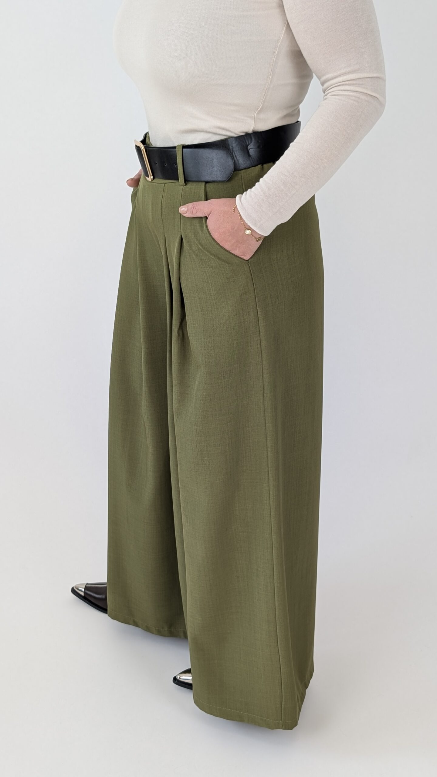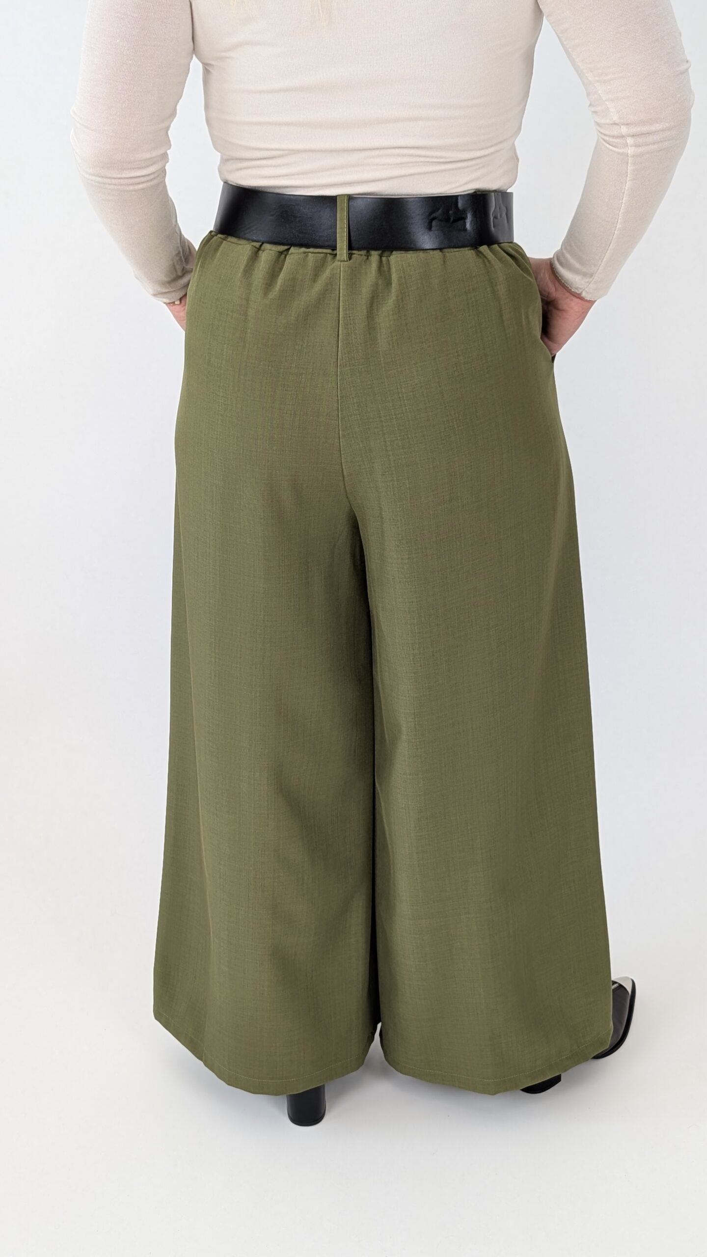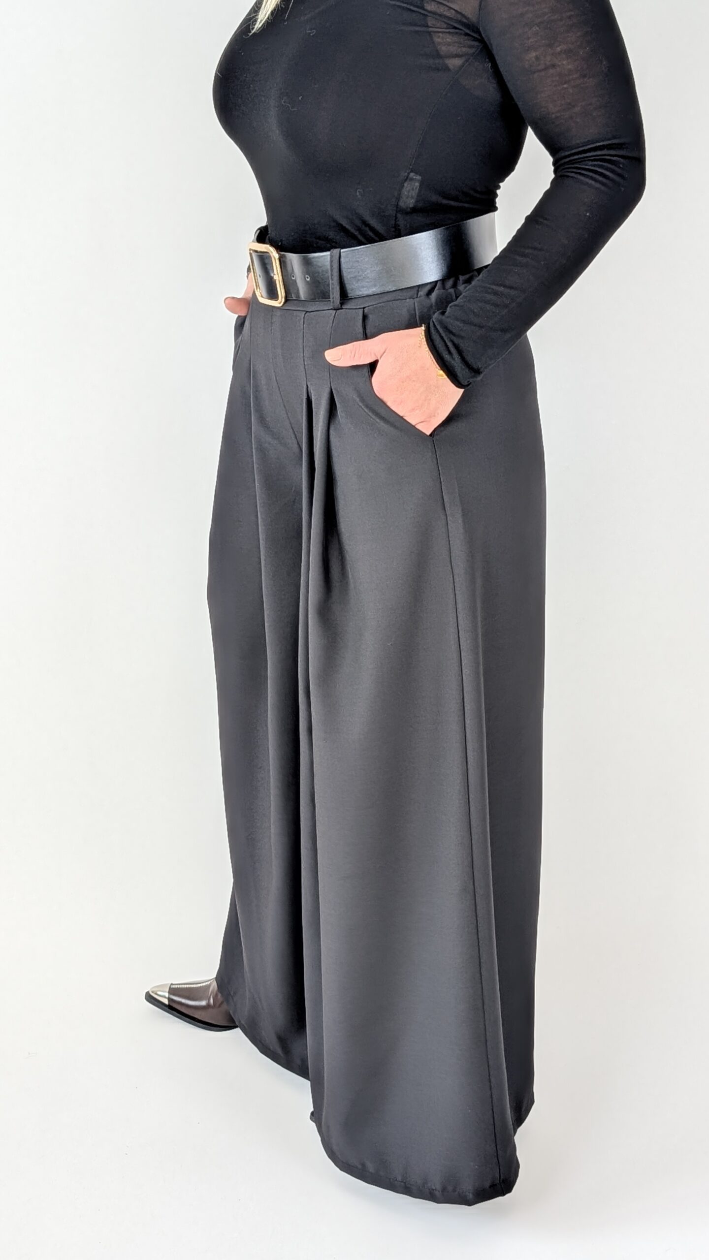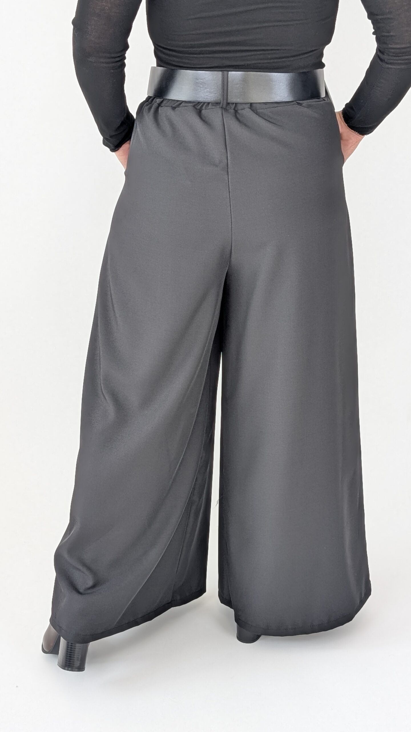Elegantne široke hlače iz mehkega poliestra z dodatkom elastana za popolno udobje. Z gubami in žepi, kroj pa lepo poudari pas in podaljša silhueto. Velikost univerzalna (38–44).