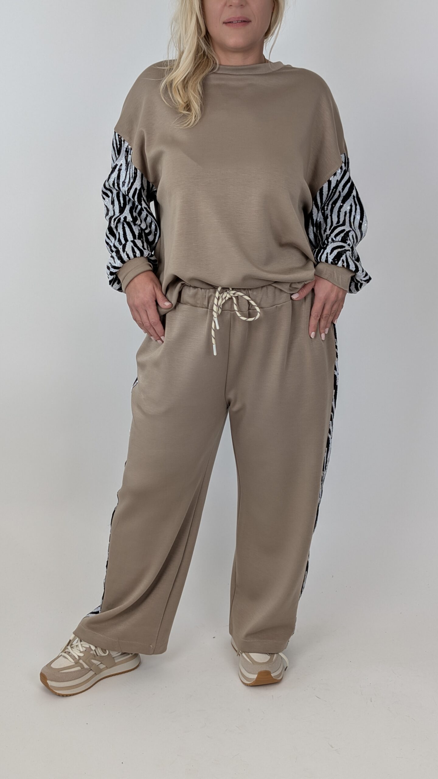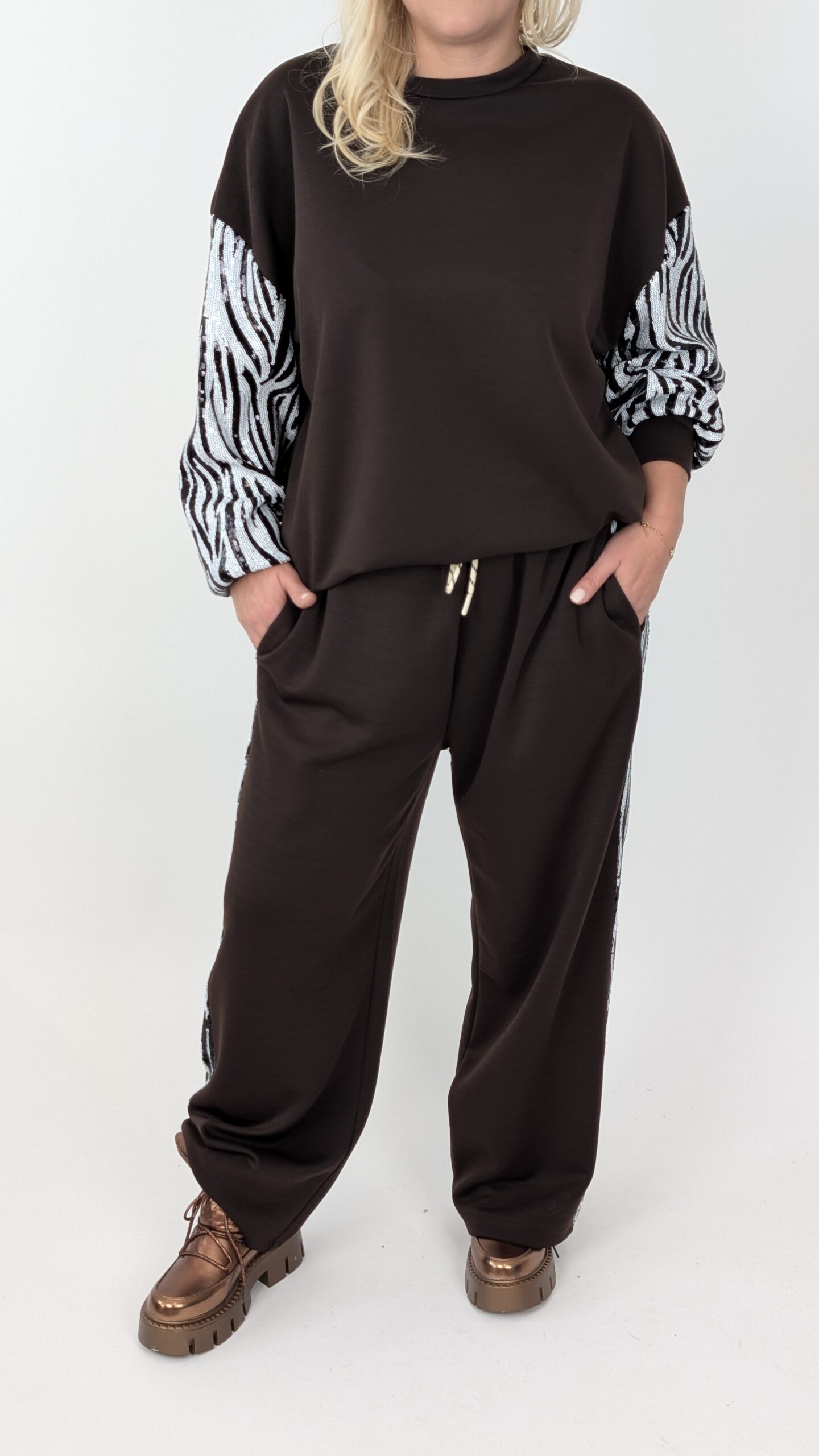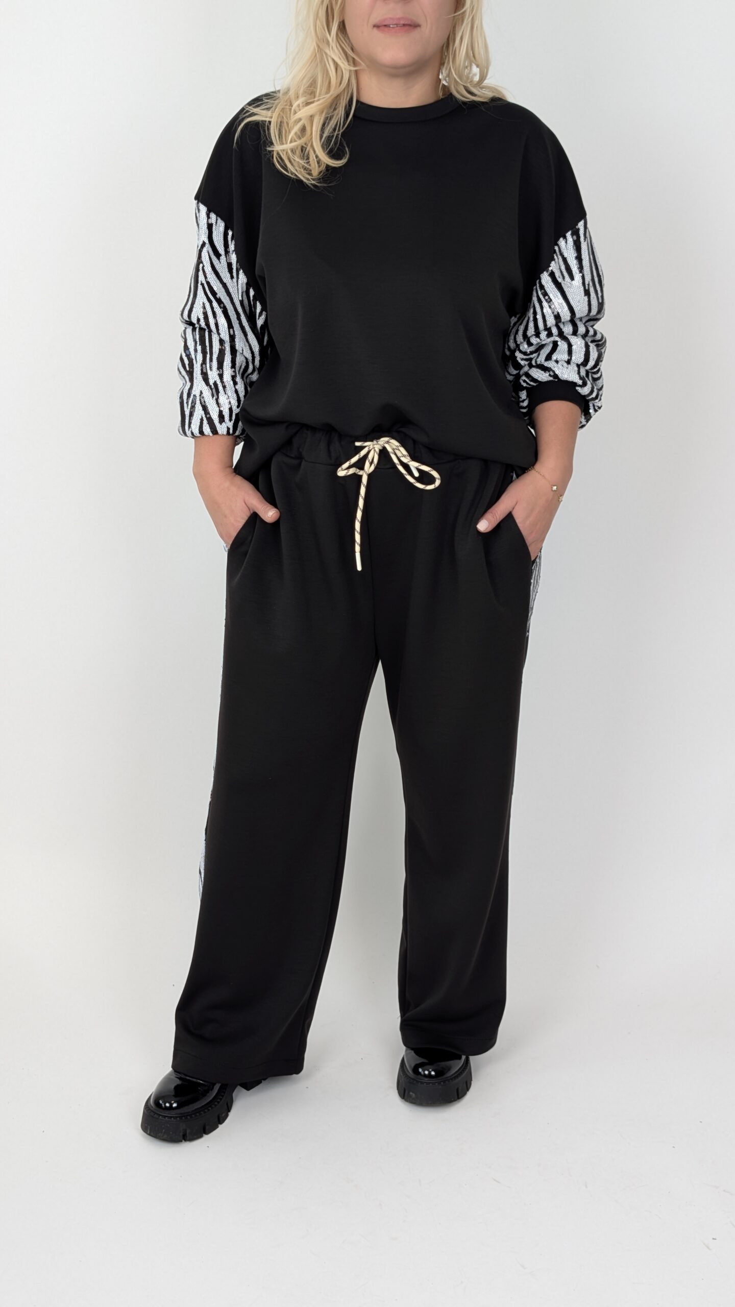 Hlače so popoln spoj udobja in glamurja. Narejene so iz viskozne mešanice, ki se lepo prilega telesu, a hkrati ohranja sproščen pad in lahkotnost. Ob straneh poteka bleščeč zebrast trak, ki subtilno podaljša silhueto in doda modni kontrast.