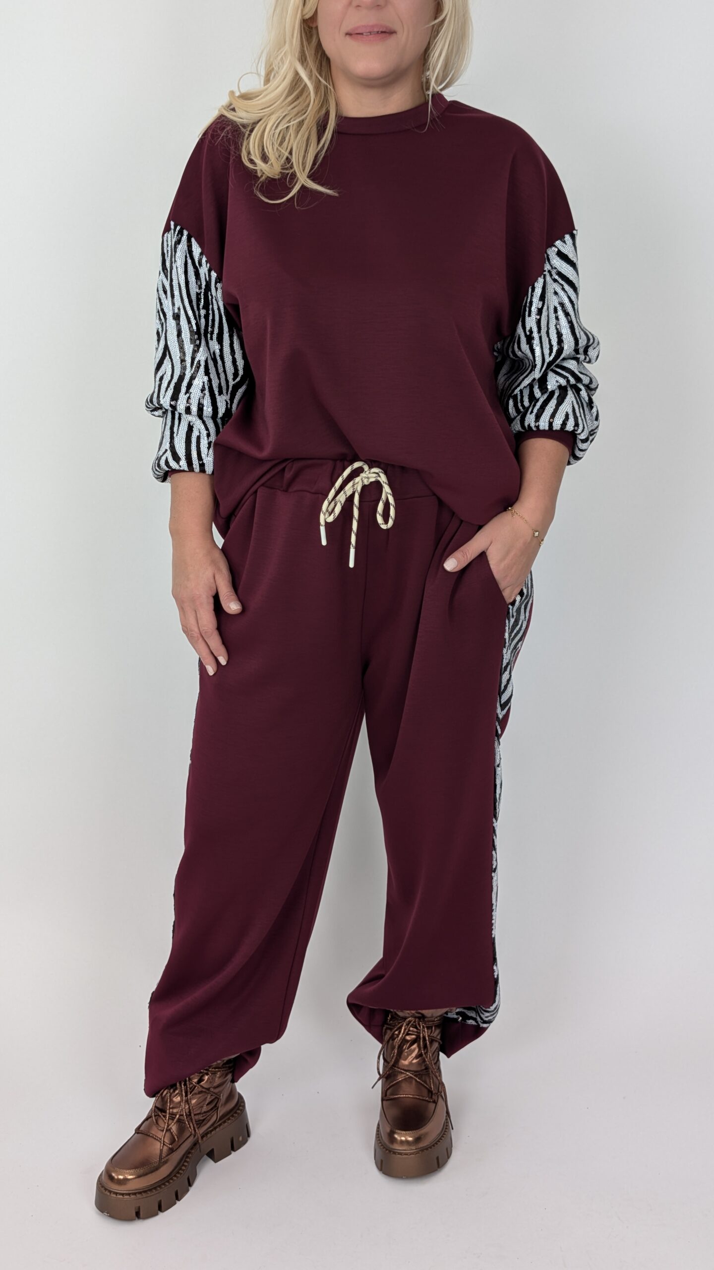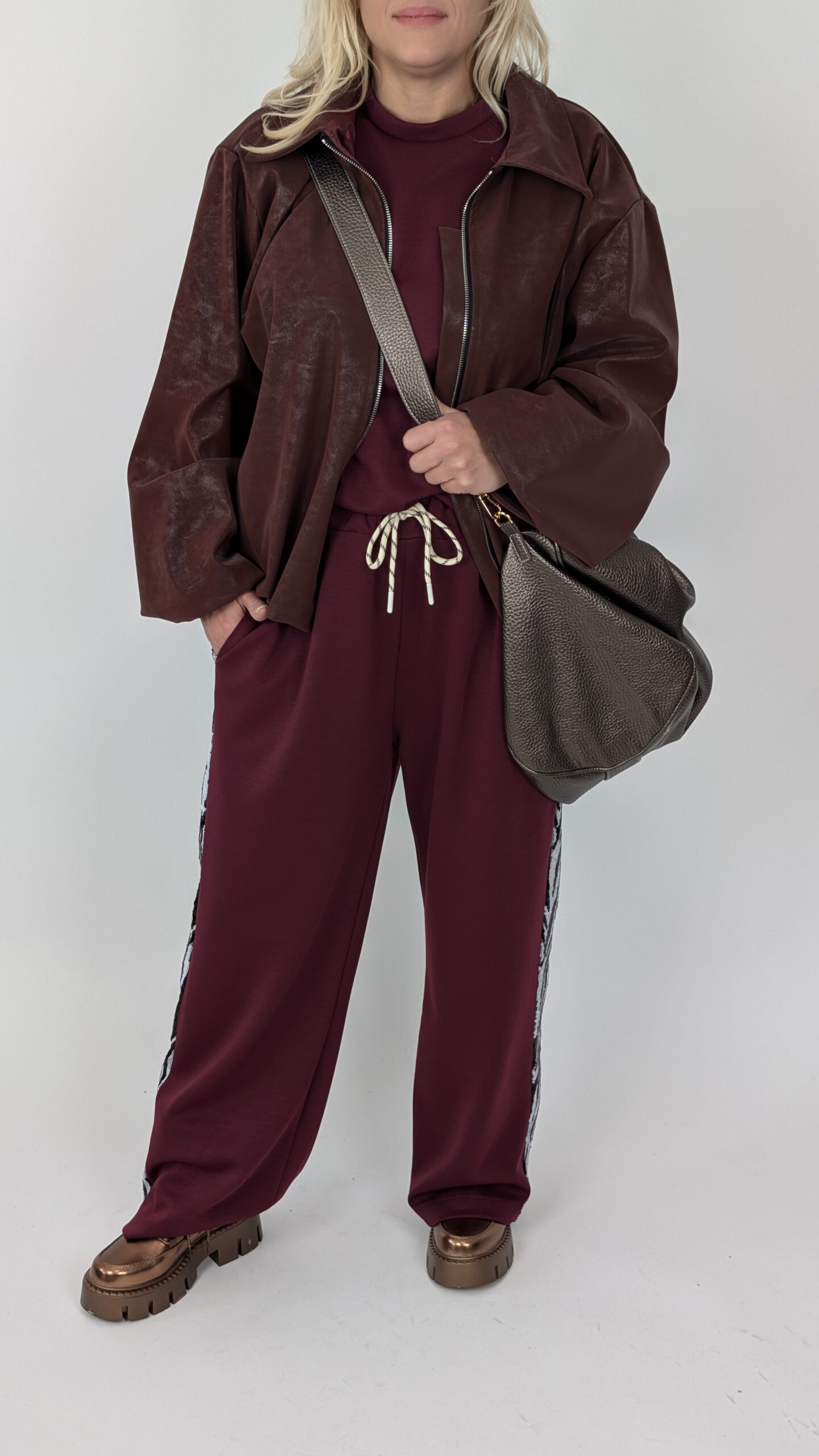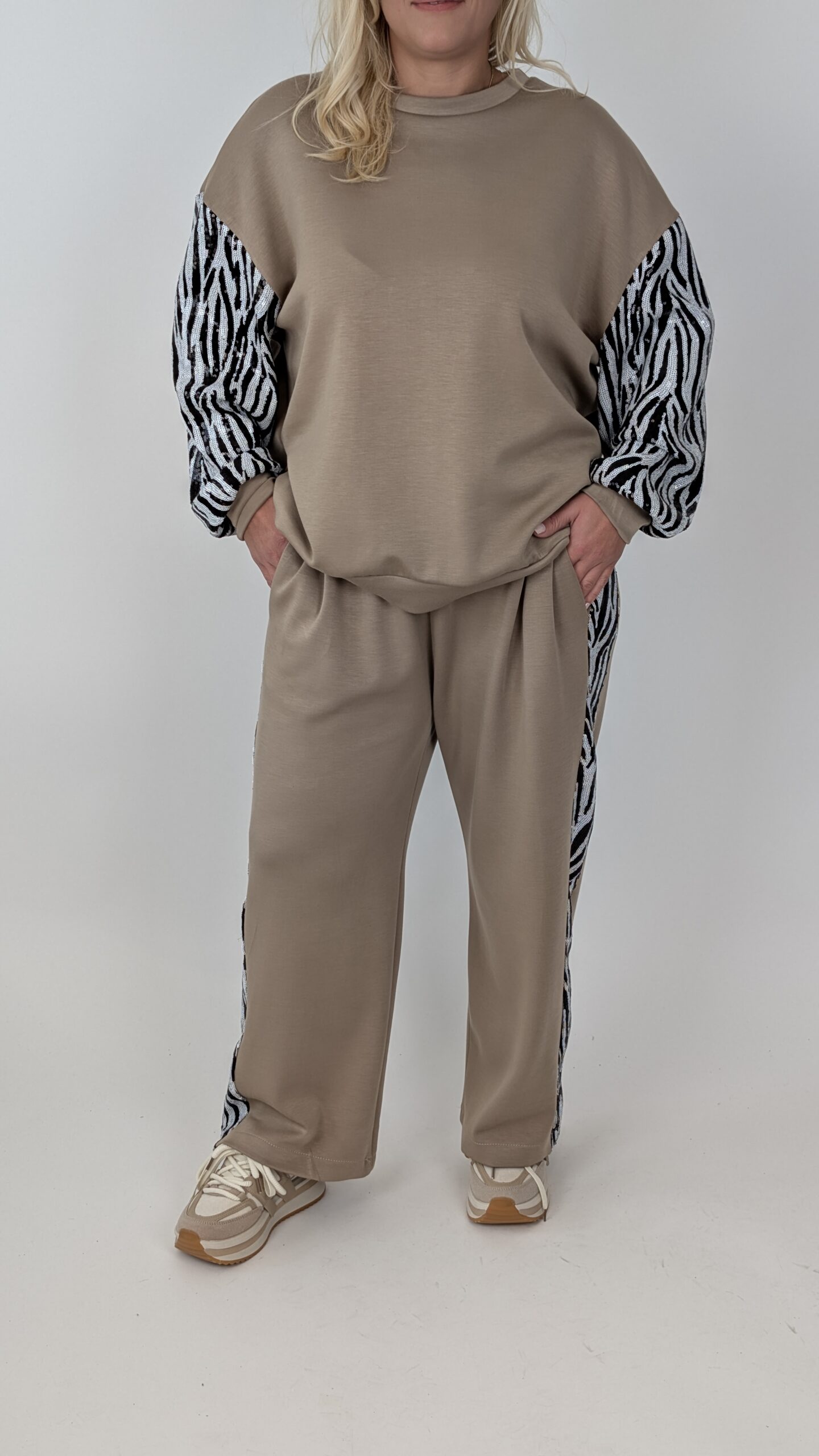 Hlače so popoln spoj udobja in glamurja. Narejene so iz viskozne mešanice, ki se lepo prilega telesu, a hkrati ohranja sproščen pad in lahkotnost. Ob straneh poteka bleščeč zebrast trak, ki subtilno podaljša silhueto in doda modni kontrast.